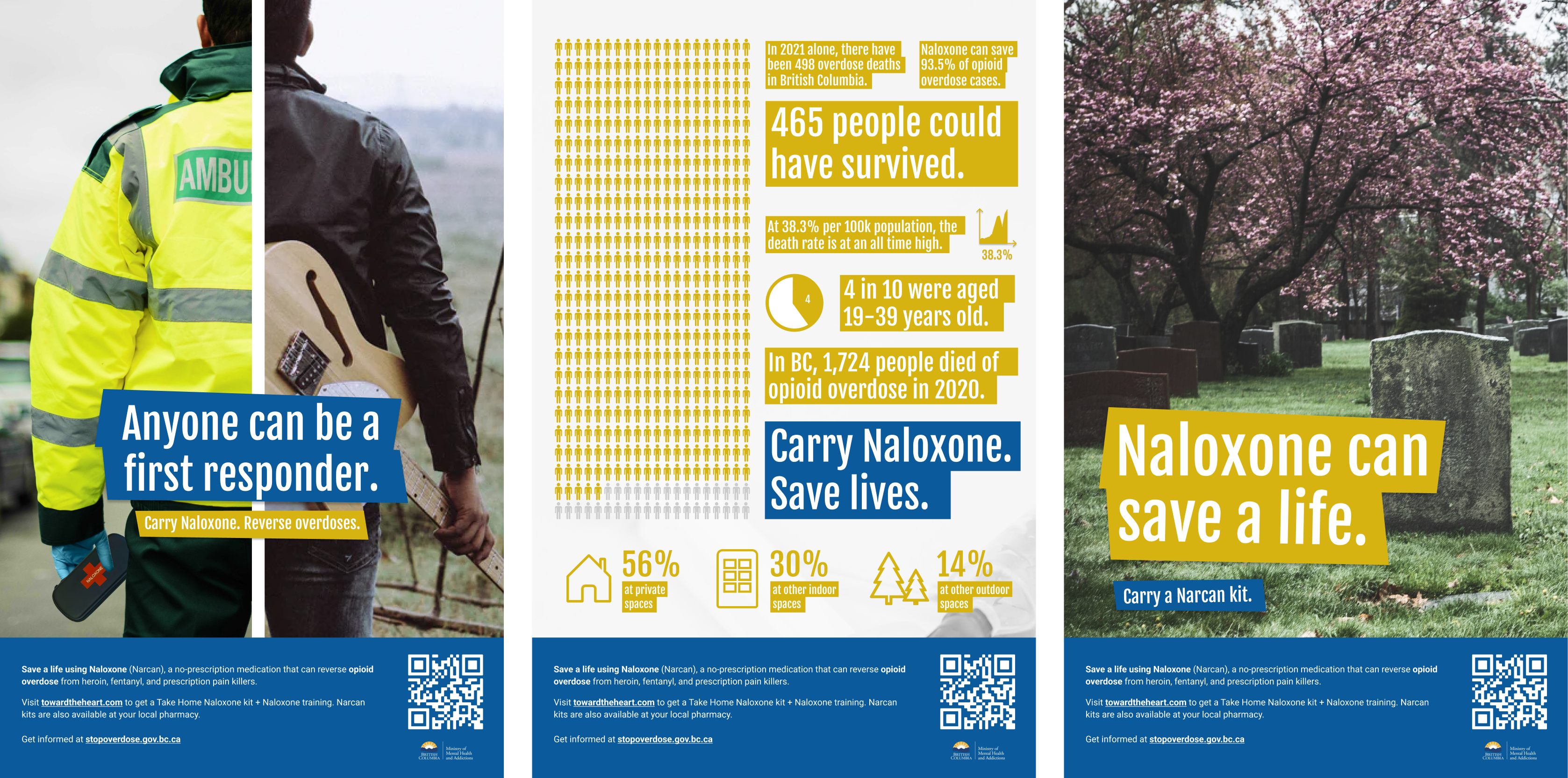 Three posters that advertises the purpose and importance of naloxone to communities in BC. The three posters employ ethos, logos, and pathos: showing a paramedic at work, using data and statistics, and using emotion to appeal to the audience.