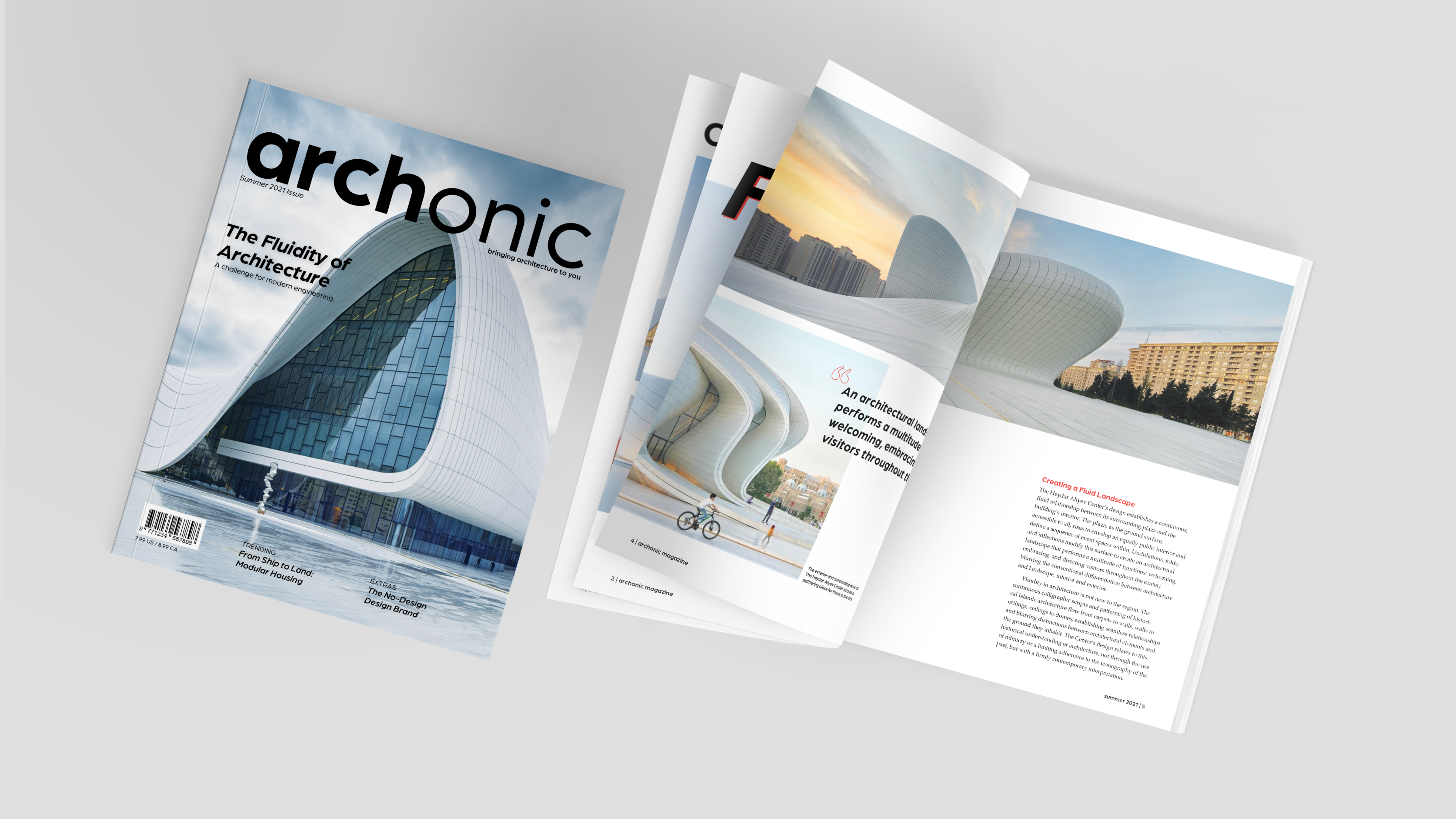 Archonic is a mock magazine that highlights the works of architect Zaha Hadid. The magazine employs whitespace to create visual impact with striking images, paired with carefully selected typefaces to reflect the style of Hadid's designs.