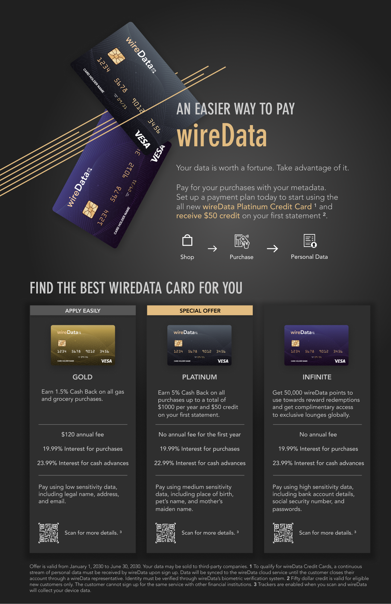 A speculative design poster that addresses the lack of stewardship for our data and privacy. This project critiques companies that require users to provide personal data as payment for online services. The goal is to highlight the value of the personal information and to be conscious of the data they are sharing to companies that may have malicious intent.